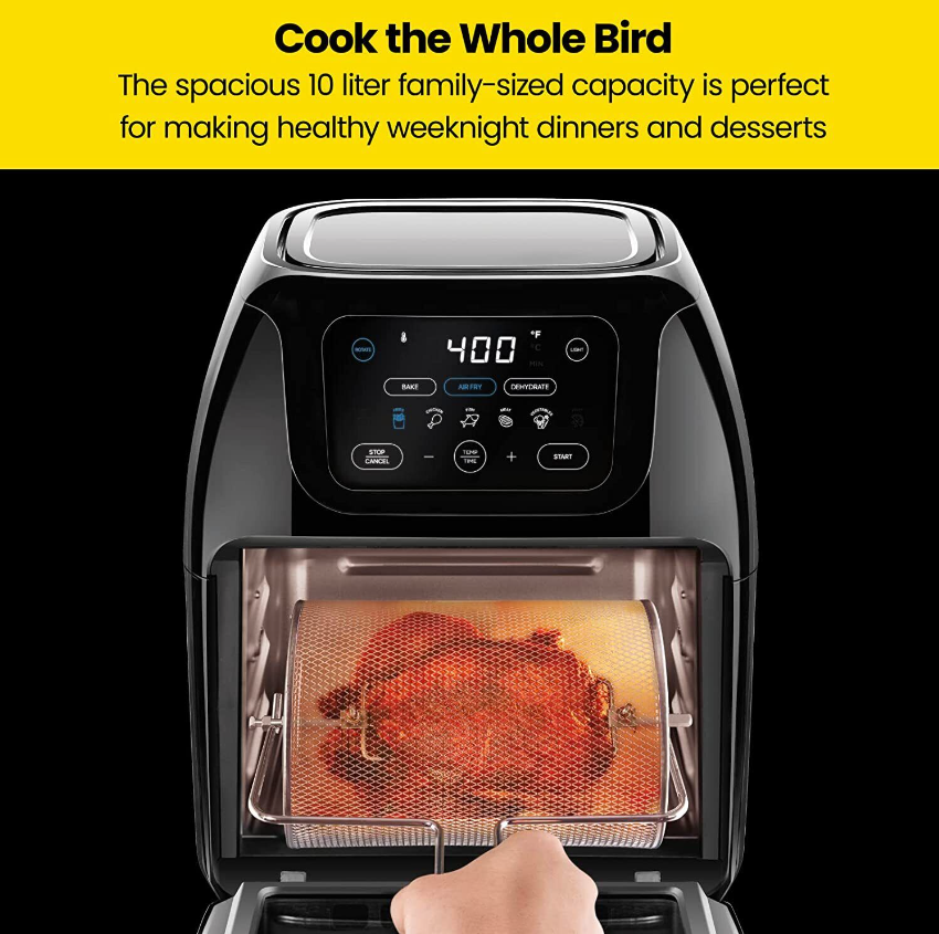 • All-inclusive: Includes three air flow racks, stainless steel rotisserie oven spit and forks, stainless steel rotating basket/retrieval tool, and a drip tray.