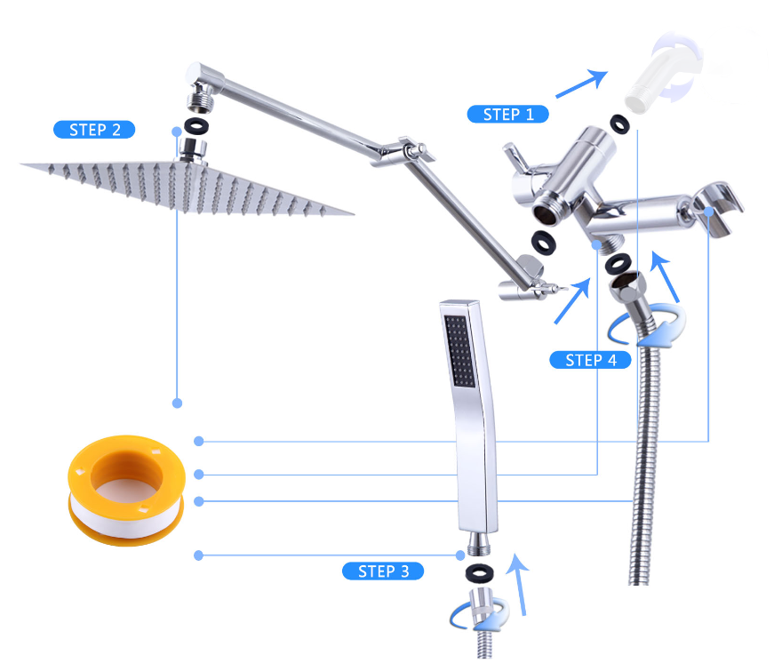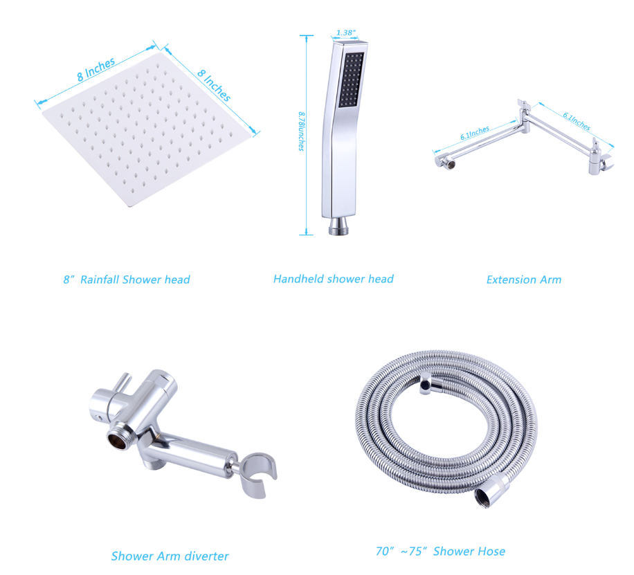 • HEIGHT AND ANGEL ADJUSTABLE EXTENSION ARM: The flexible extension arm, made of solid brass allows you to adjust the height and angle of the shower system in need, and the knobs are tight enough to ensure the showerhead can stay in place. The free-spinning locking collar allows you to tighten the extender in a correct position