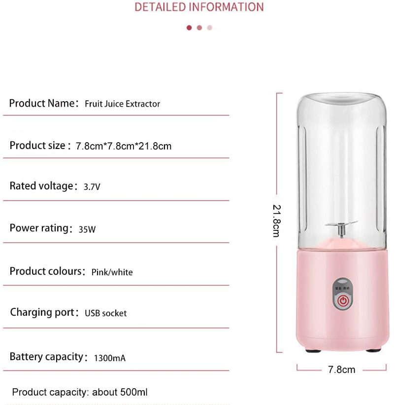 • Product features: personal mini juice machine capacity 500ml, net weight 250g, its convenient, fast, easy to carry. Using 3.7V voltage, 35W power, safe and efficient. Built-in 1200mA, use more durable.