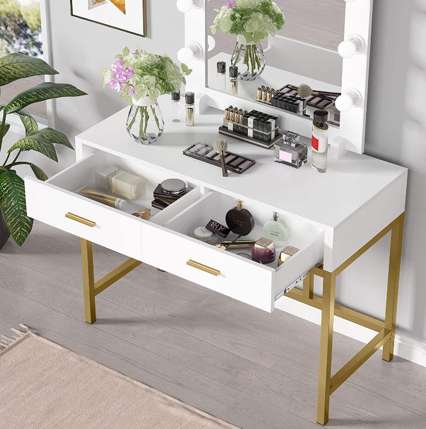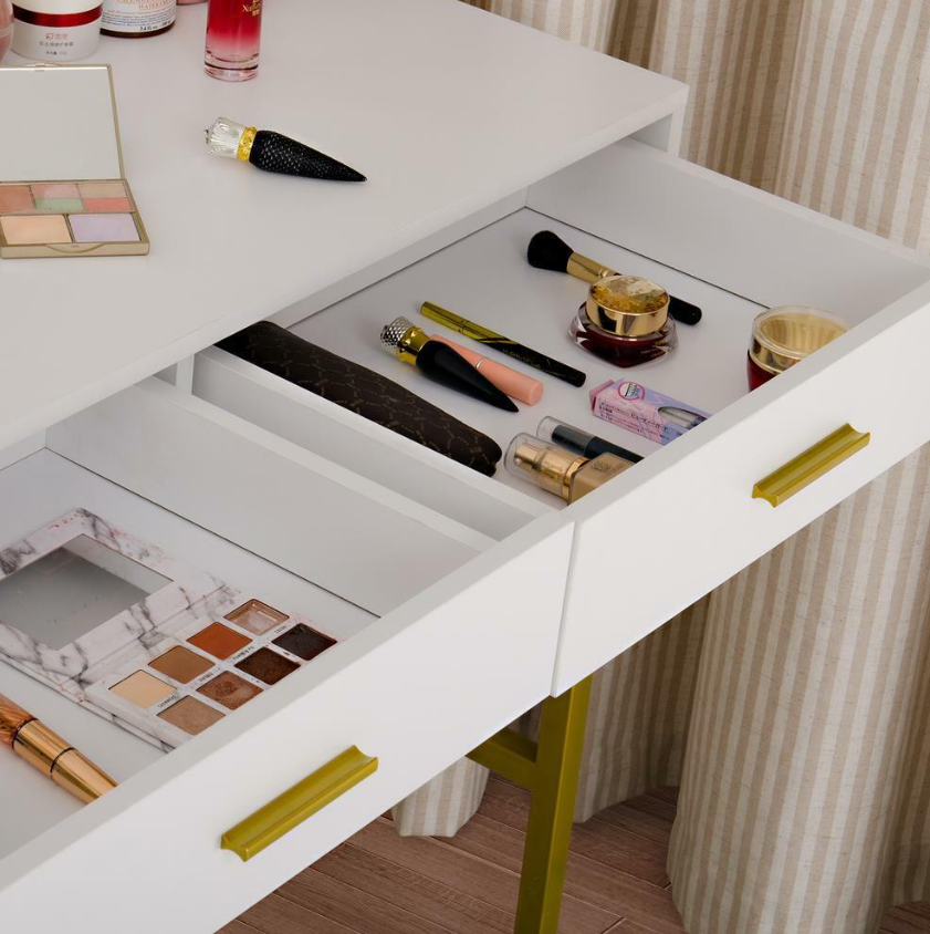 • GALORE STORAGE SPACE: This makeup table features 2 big drawers for keeping all of your jewelry, makeup, and accessories corralled, while a large tabletop (39.7” L x 17.7” W) offers plenty of room to stage cosmetics, perfumes, and other frequently-used beauty essentials for quick and easy access.