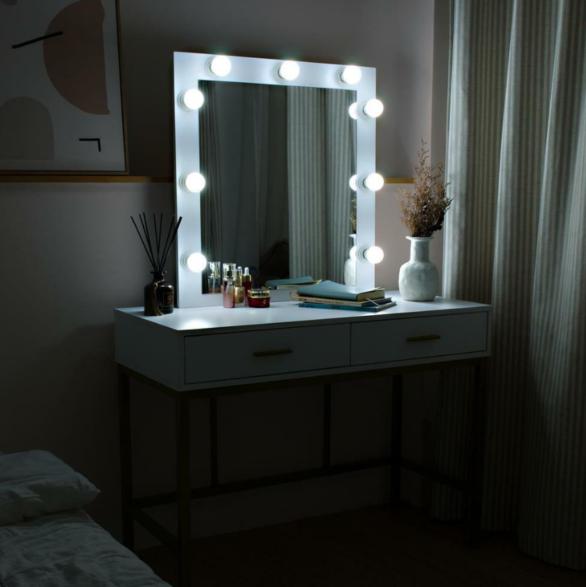 • STYLISH YET FUNCTIONAL: This elegant lighted vanity table with mirror and 9 Hollywood style LED Light Bulbs will glamorize your bedroom or changing area that you've always dreamed of owning. Get the full picture in the large mirror with soft and non-dazzling light to prep for the coming day or primp for a night out.